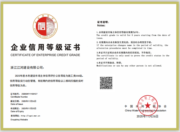 公司榮獲2020年度水利建設市場主體信用評價施工類AAA級