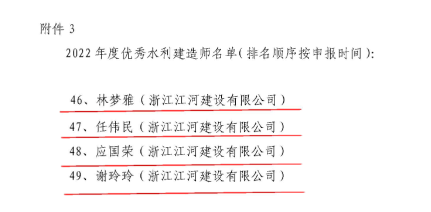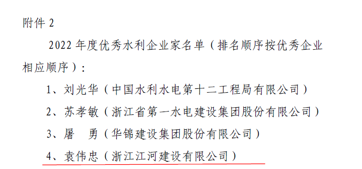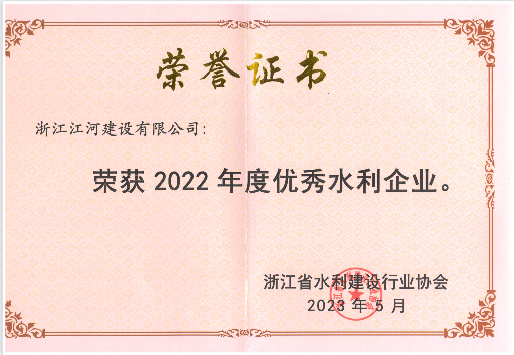 近日,江河建設迎來榮譽獎項豐收季。公司獲“2022年度浙江省優秀水利企業”、“2022年度浙江省建筑業先進企業”、“浙江省信用協會2022年度誠信浙商優秀單位”、“紹興市民營企業100強”三項榮譽,公司董事長袁偉忠榮獲“2022年度優秀水利企業家”、“2022年度浙江省建筑業優秀企業家”稱號,林夢雅、應國榮、任偉民、謝玲玲等4人獲“2022年度優秀水利建造師”稱號。